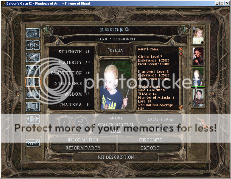The party made it out of Chateau Irenicus as well as defeated the Suna Sunei ambush. The hardest part in Irencus' dungeon was the mephits guarding the genie lamp -- well as it turned out I found out yet another target for hasted, blessed, chanted skeletons, they did great clearing the mephits for us. The rest of the dungeon proceeded without incident. Although Hanna almost died to the trap by the big pipe before the room with the wand traps - if she didn't have armor of faith active I think she would have died.