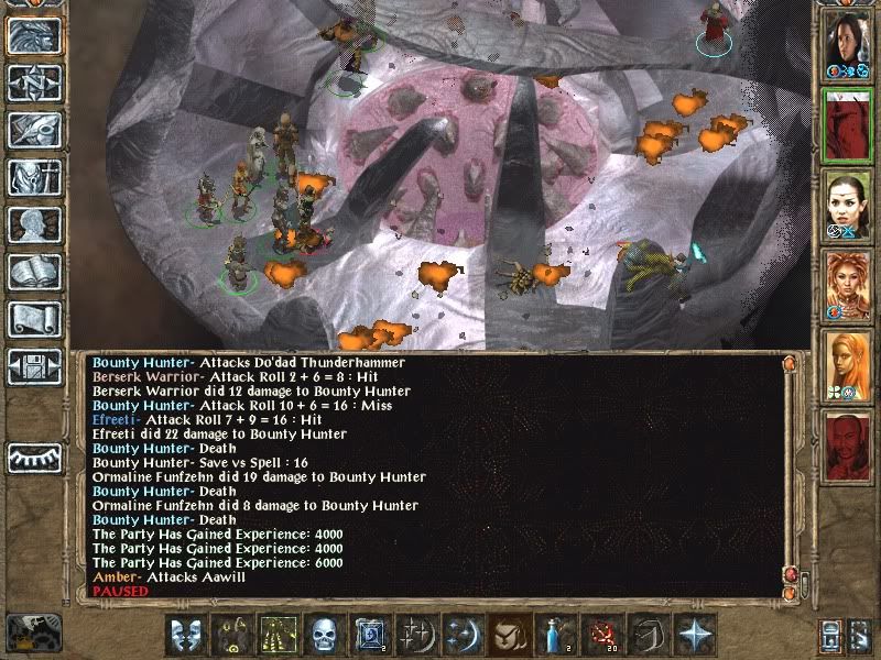 All right time to scout, okay Irenicus is in the south portion of the area..fire elemental running around in fear. Irenicus tries a true sight but it's useless, still using cloak of non-detection. Picenon thought, okay Irenicus has ton of melee protections like improved mantle, stoneskins, not to mention contigencies like protection from magic weapons, how about fight fire with fire (e.g. magic). You guessed it, it's cloudkills from the shadows time! This worked for a while, but Irenicus eventually saw him - tried to cast maze, but thanks to his haste boots Picenon got out of range in time...Picenon scouted around and saw his cloudkills were only hurting Irenicus simulcrum again (or maybe a mislead, not sure). Picenon tried to detect illusions but it did nothiing...hmmm..meanwhile the invisible Irenicus was apporaching Picenon....
