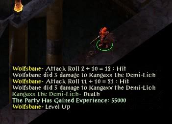 No shortcuts with Kangaxx - he was immune against destroy undead. However, the protection from magic scroll was still operating and initially stood Wolfsbane in good stead while he used Azuredge to kill a couple of bonefiends. Kangaxx tried destroying magic protection via wish as well as spellstrike, but without result (I didn't install the SCS component allowing spellstrike to take down a protection from magic scroll) so his timestops were not too much of a threat. Azuredge killed the summoned fiends and initial lich form, but could not hit the demi-lich. Wolfsbane had been saving up darts from the cloak of stars for some time and, once all the protection from magic weapons spells were used up, he let fly with a hail of those. While he was doing that his scroll ran out and Kangaxx immediately used a greater malison - bringing Wolfbane's save vs spells down to just -1. He countered with a charge from Horn of Kazgoroth, but a flurry of wiltings from Kangaxx (only doing around 20 damage each, but that still wears you down after a while) induced him to run away and drink all his remaining standard healing potions from the dungeon before raging again and returning. Kangaxx tried several more wiltings, but didn't get HPs down quite far enough to allow his power word kills a chance to work.