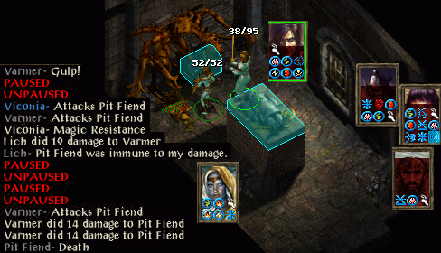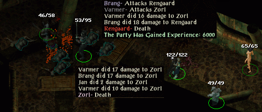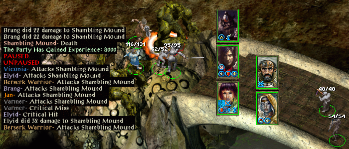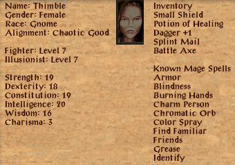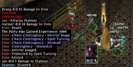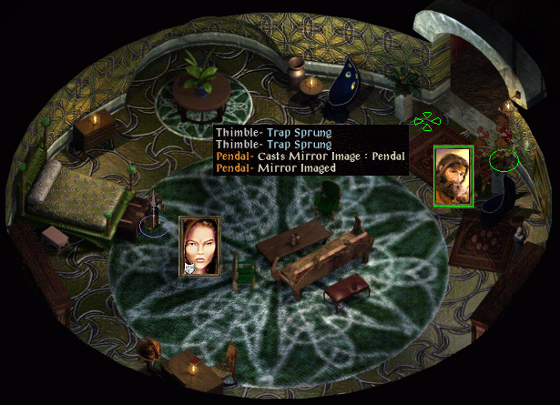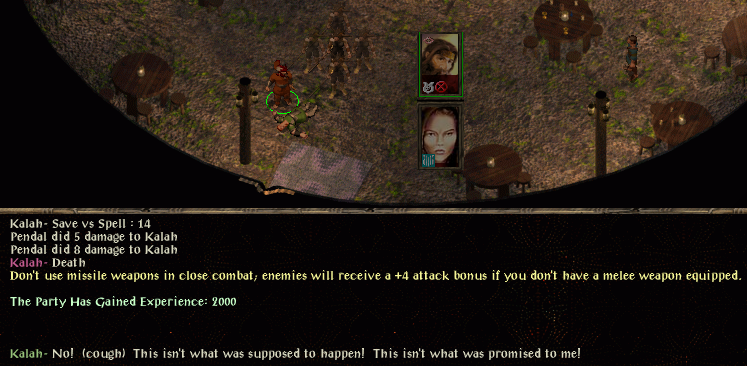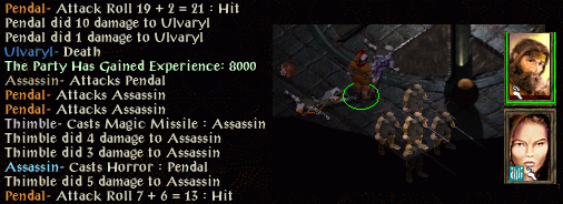 <sigh> And then.... I had to go back to Athkatla to get Jaheira raised. I went straight to the temple district, only to find out that we didn't have enough money, and would have to go back to the Promenade to sell some stuff. And then... I got hit by two messengers: Aerie's, starting a second timer that will require us to visit both the circus and the Bridge District Playhouse, NOW, and... Ano's, informing us of his sister's untimely death, which will require us to visit the Government District, NOW. ROFL. This game can get rather... complicated... in keeping a party together. And I expect a messenger informing me that I must take Jan NOW to help his family any moment.