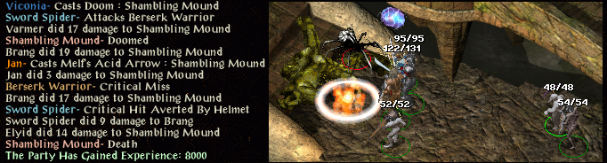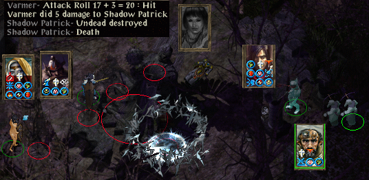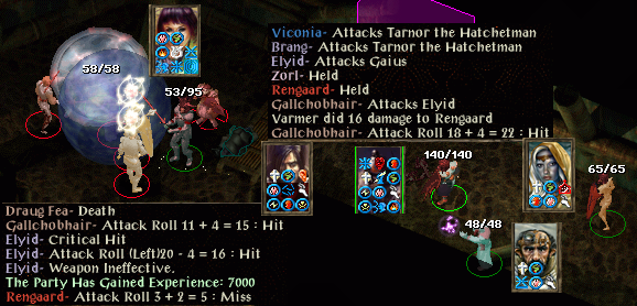 First try to get out, got smacked with the poisoned Renfield and the thug party caught in the act. So many spells flew around here I can hardly summarize it with clear detail. Reminded me of the USA national anthem as far as "rockets red glare and bombs bursting in air." As much as I can remember, there were magic missiles and hold persons and stinking clouds and holy smites and insect swarms lighting up the screen like a July 4th fireworks display. Quite thrilling to have so many magicals in my party, actually. Only muggle is Minsc, who will be Aerie's and my warder. (Really hers, but since I will be her husband, eventually....)