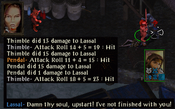The battle against Sendai and her drow adds went pretty well. The 3 front-liners were awesome, as usual. it wasn't without its hitches, however. For one, Imoen (who had the only RoR) and Anomen died very early in the battle. Most of the time, I let the melees do their scripts and controlled Edwin (who is the only party member without a script), and just re-directed melees to the targets I wanted.