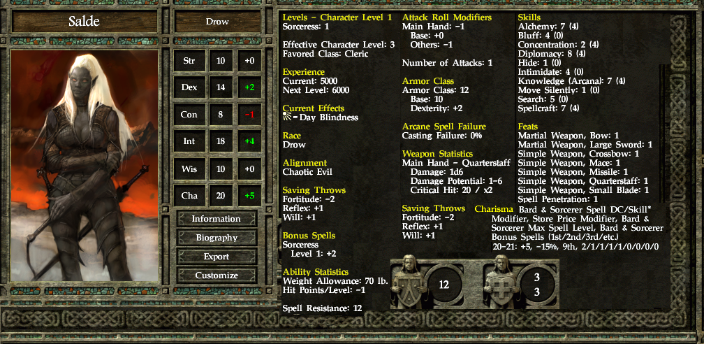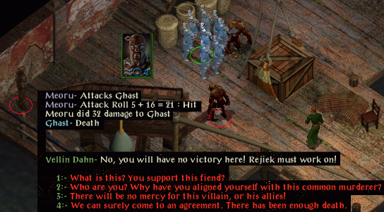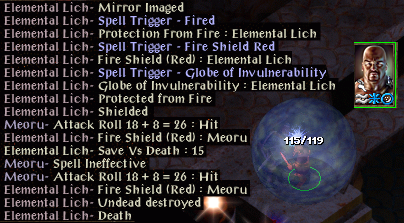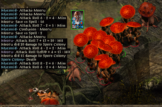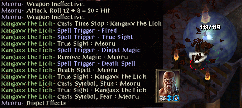Yakman is 1/2 health, he wanted to rest but the game wouldn't let him. So instead he headed to Waukeen's Promenade...and hit the Suna Suni ambush! Yakman could NOT enrage, none were left, so he did bhaal horror, which only got two enemies and not the mage then moved to the top the map and potioned then meleed the close enemies. The mage was pumping Yakman with damage. Yakman finally attacked the mage, and the mage cast charm person! If that took (save vs. spells is 6) it would have been over, but Yakman saved and trashed the mage with his excellent axe.