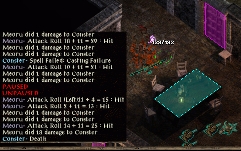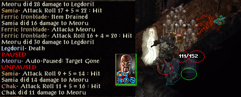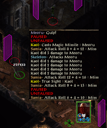 Kitthix is waiting in a corridor while the berserk warrior is in a chamber. I have cast auto-pause DUHM, mirror image and improved haste THACO -17/-8 and 9APR as I return to the warrior and find Samia is turning hostile. Kaol gets a stoneskin up before I hit not good so I switch targets; Akae and Legdoril are first to go. I have to run though, glugging a potion of defence then healing. Kaol casts chaos and with a dirty aura I can only continue running. Despite my saves does it offer one the chaos hits and a badly wounded kensai is out of his mind with a trio of enemies in reach and more nearby.