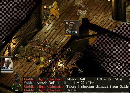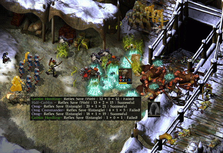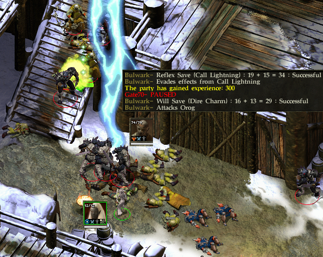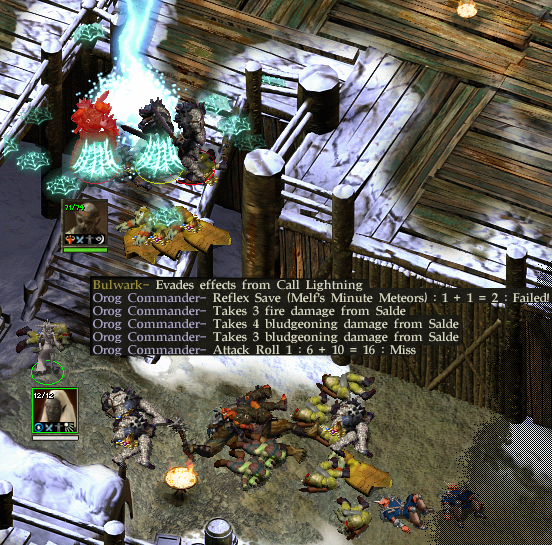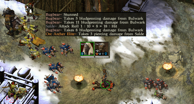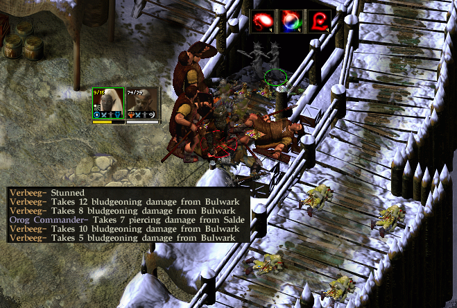 Pendal Fighter 11 / Illusionist 12. 212 BG1 kills.Attempt 2 at the fortress exterior starts off well, but by this time Salde has almost exhausted her spells. Bulwark explores a bit too far and is stunned by a chromatic orb. Enemies surround him with a shaman beyond, so Salde uses three flaming oils but the orcs survive long enough to kill Bulwark. Salde is emptying a scrollcase and casts skulltrap but the casting is so long that the enemies have passed it. She decides to run a circuit of the fortress and lead them into the skull, only to discover a lot more enemies are waiting to de-buff her and kill her with various imbued missiles. Reload 3 (I think, possibly 4), 2nd in this fight.