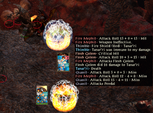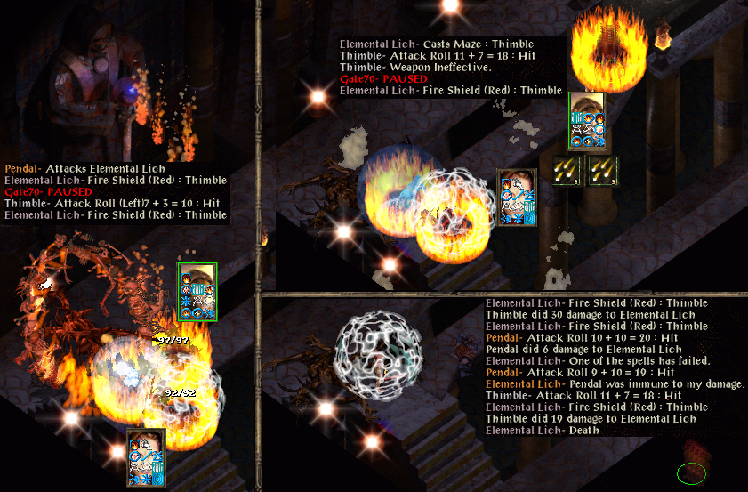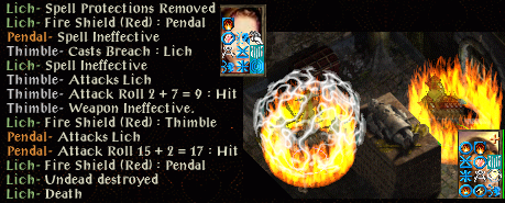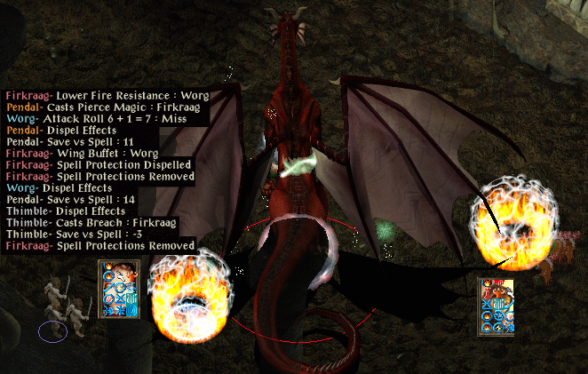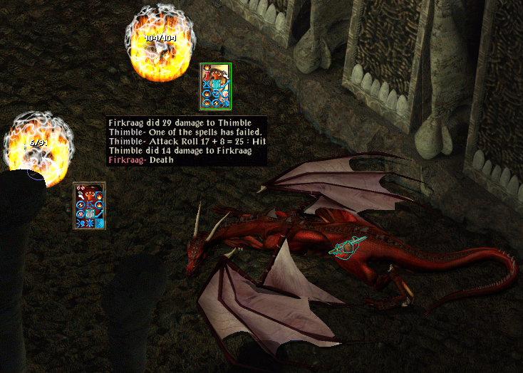 On to Firkraag. Thimble has Flail of Ages/Belm and Pendal has the red shield/helm/Dragonslayer. Potions of strength, speed and (for Thimble) fire resistance are active plus maybe a heroism, with spell buffs too. Firkraag takes a few hits from either side and stoneskins, so Pendal casts pierce magic while Thimble adds breach. Another pierce magic and hold monster is attempted, but unsuccessful. As is a second hold monster; back to melee with some magic missiles and a couple more summons. Thimble takes two huge hits but responds to take another mighty scalp. Time to sit down next to the huge corpse and read more of Icewind Dale II.