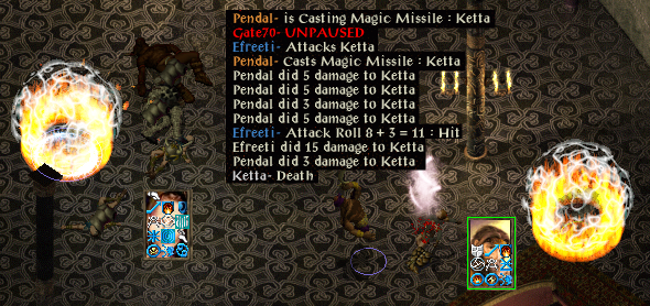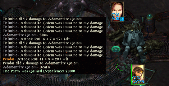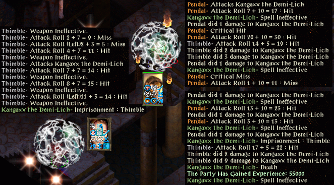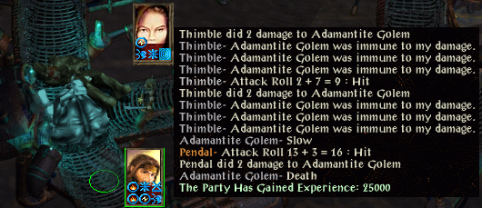 Pendal Fighter 12 / Illusionist 13. 212 BG1 kills. 274 (+10) BG2 kills. Adamantite golem.The final part of the fortress exterior battle is carefully done then the interior sees a group of chieftains followed by Guthra and his casters then ending up with the Jailkeeper and a pair of cooks. Once the enemies are defeated the lone prisoner (Braston) is returned to his partner (Ennelia). A good session, and as Grond0 noted the sorcerer buffs to a monk make for a potent combination.