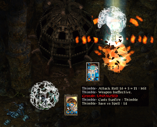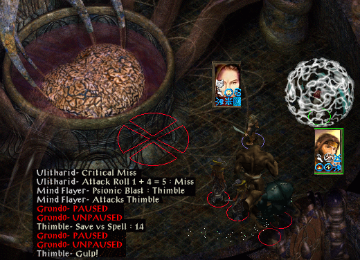 finishing the mind flayer. Some time later Pendal recovers (and the game text says Mind Flayer dead...Mind Flayer charmed). Another flayer is charmed to open doors and all goes well until the elder brain, illithid and brain golems kill Thimble. Pendal is all alone in a small room with at least half a dozen enemies and a locked door so he knuckles down and uses a rod of resurrection before dragging as many enemies away as he can so she can make a safe route to her gear.