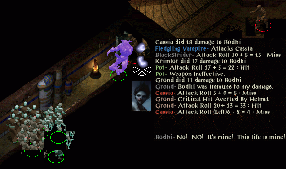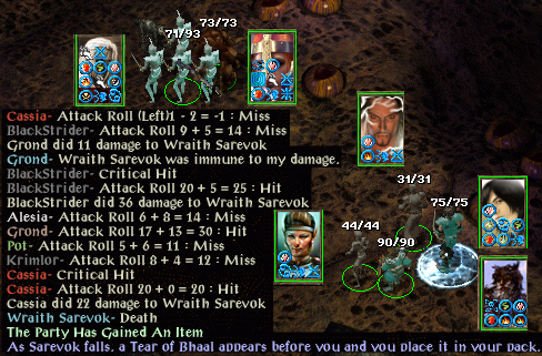 Cassia and Anath get on like cats and dogs, then we clear the wilderness (stop staring at that rocky outcrop like your job is on the line Grond). Krimlor sanctuary-turns the undead flanking Anath and then Cassia approaches to turn a huge mirror. Once we are underground Krimlor realises his turning ability (level 12) is not good enough to fight the more powerful undead down here; so we fight instead. After freeing Mazzy Fentan we find a huge stone idol. Blackstrider ignores the poor clerical advice from Krimlor and correctly bluffs all nine answers.