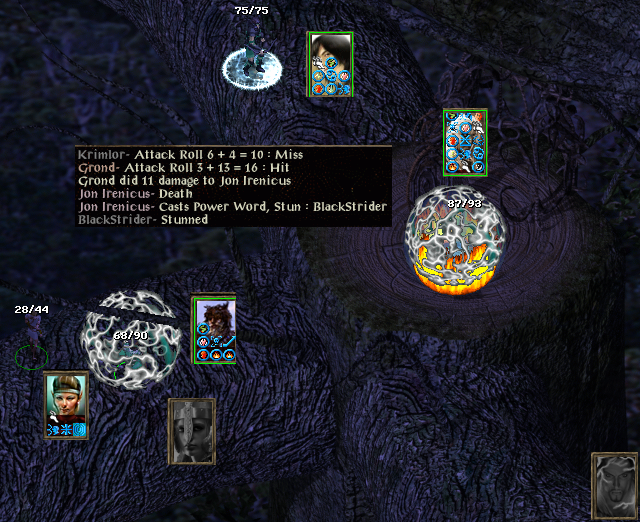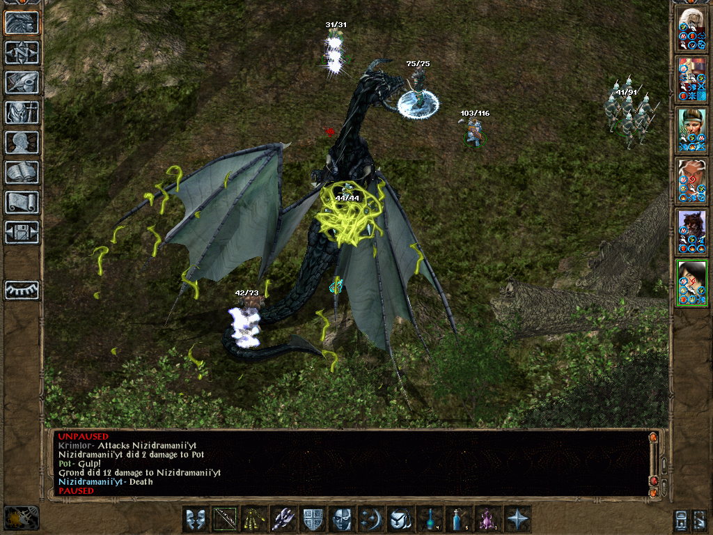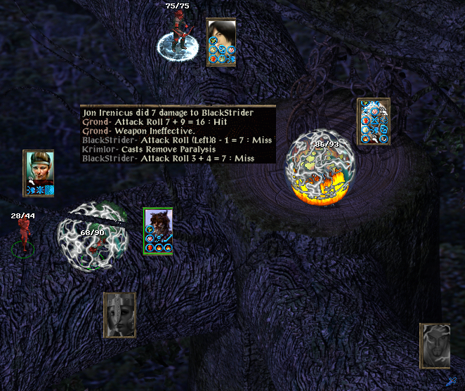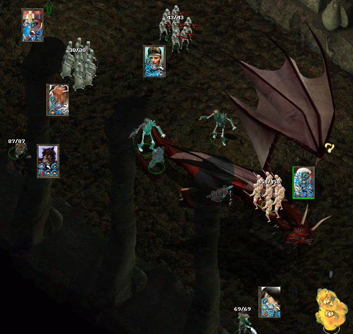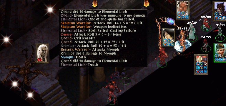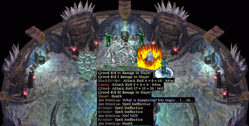 Firkraag. A Tenser helps Blackstrider do a fine job of melee while Pot casts Pierce Shield. A second doom works but we have forgotten to memorise any greater malisons, so spell sequencers and more spells fire volleys of Magic Missiles. Grond is hitting with his lightning bow (should have activated Called Shot). Krimlor is something of a passenger as is a buffeted Cassia, but his summoned aerial servant is not and fells the huge dragon.