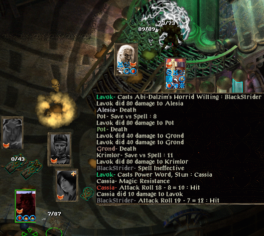 damage is done - Krimlor crawling away (just seen he saved & still took 80 damage) while Pot, Alesia and Grond are not so fortunate. Krimlor only has one spell memorised so raises Grond, who grabs his bow and strikes a series of shots into Lavok to help Blackstrider. Once Lavok is mortally wounded we rest so Alesia and Pot can be raised AGAIN. Krimlor can hardly look at them, knowing his carelessness is costing the party dear and he’s beginning to lose count of the revivals.