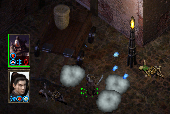 Maldor normally dual-wields long swords, though he has yet to pick up something to match Varscona (his primary weapon in BG1). Stari has done most of her work with MM / MMM for damage and invisibility and blind for tactical use. Quite a few of her available spells (chill touch, spook, blur, skull trap and remove magic) have not been used at all as yet, but should get a chance to prove their worth during BG2.