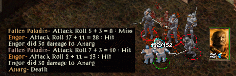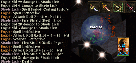 There are too many enemies with spells flying everywhere and after two of the closest are killed Engor retreats. Two more are killed on the way then Engor rebuffs with DUHM and Improved Haste (2 of 3) as the warden has also followed. He casts fireshield as Engor arrives so the kensai continues on and clears the remaining enemies with the 3rd improved haste and an Arbane haste so only the warden is left. Engor is bleeding badly (hp’s down in the 30’s so glugged an extra healer) so he waits a few seconds before returning to the warden.