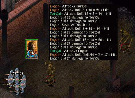 Engor has oils of speed, potions of mind focusing, defence and regeneration so has to look for a magic protection scroll and a decent strength potion. As this will be a race against time he will buff after speaking to Gaal and returning to the City Gates - requiring Daystar as he has no suitable weapon to hand. Ribald has a scroll and Roger the Fence a Storm Giant potion. There is no sign of Keldorn so Engor realises he has to check-in at the Temple of Helm first. Might as well pick up some restoration and undead scrolls in case of emergencies. Two vampiric mists drain Engor (to 13) but he waits until a trap near Sassar drains him further (to 11) , and as he is returning to the Crooked Crane he asks Dawnmaster Kreel to restore him so the scrolls can be kept for more pressing times.