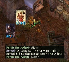 Berud's not having rage available may have handicapped him slightly, but a potion of stone form helped protect him against the spells being slung around and the fight was pretty simple. Berud took most of the early attacks and left Quash to finish off Sion while he took some others for a wander. Quash then joined him in double-teaming anyone that got slightly separated. Ketta's repeated backstabs from invisible were simply ignored in the best barbarian tradition, until he was the only one left.