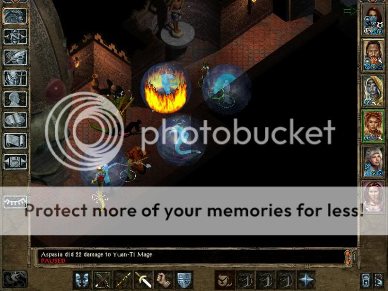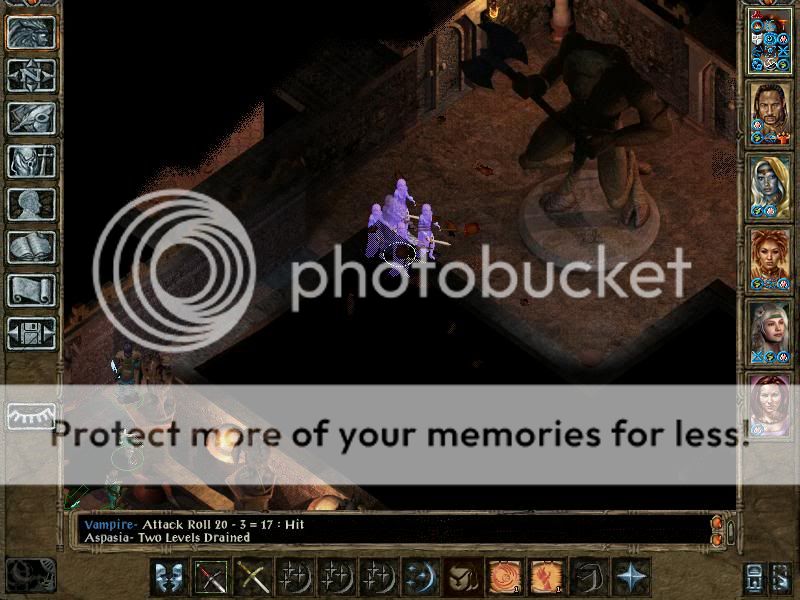 First two rooms are nothing special (the thrall mage still stood around without casting anything... I thought this was fixed) except the flayers do quite some damage with their ballistic attack and detonate powers. The former is crushing and the latter magic damage, it would seem. Potions of fortitude and heroism keep Mazzy and Valygar alive for these fights, while ProME + stoneskin saves Aspasia and Tashia.