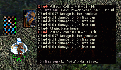 Slayer Irenicus is located and a dispel fired but despite some buffs dropping he is immune to both Celestial Fury and the Flail of Ages. Chud moves back to equip the Tuigan shortbow and sees a maze spell heading in his direction.
