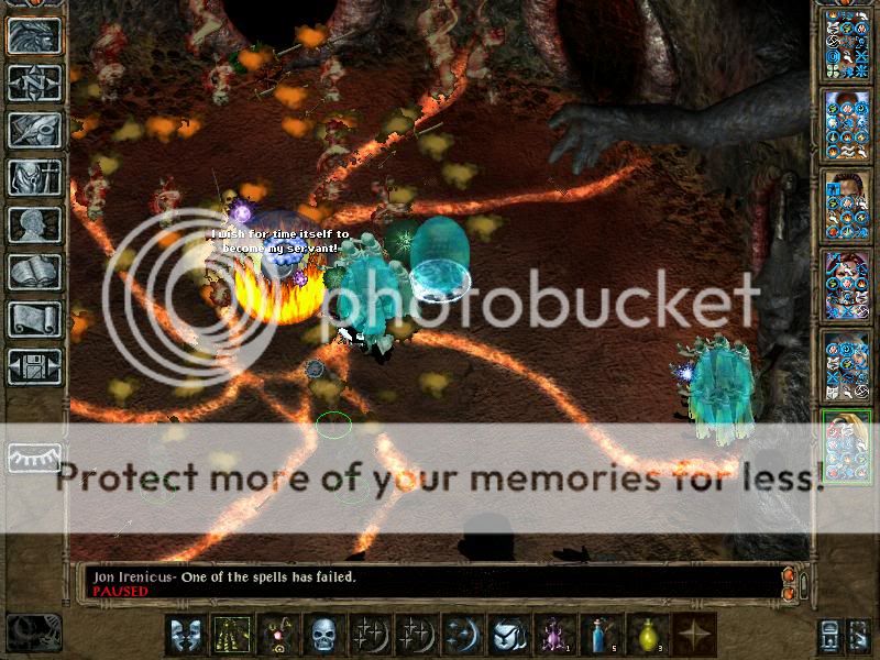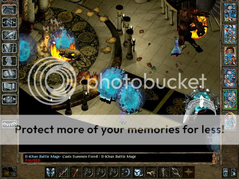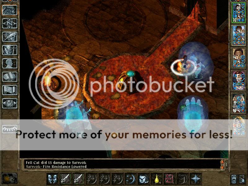 Exploiting really is boring. After obtaining 620 000 total gold, I decided this is enough (unfortunately, it is not, and the party's definitely gonna have some money trouble later, but not big ones). Also, the party completed the Unseeing Eye quest. This is not as easy as it sounds. The Gauths now have Anti-Magic rays. Moreover. those rays are not stopped by Spell Shield anymore, and Shield of Balduran is omitted from IA anyways. However, the beholders and gauths shoot their rays not so fast anymore (4 rays per round), but they choose always the best option for their rays (meaning, if the target is protected, their first choice is Anti-Magic ray). They have many HP (for example, 3 Dragon Breaths are insufficient to kill them). However, they have also been deprived of several rays, more importantly Death Ray, which means summons can approach them safely. However, even Skeleton Warriors don't fare well vs Beholder's melee capabilities. However, the monsters summoned from the new Monster Summoning spells are excellent, especially the Greater Yuan-ti. This is solely thanx to their innate resistances, meaning partial resistance to Magic Damage and Electricity. For example, where Planetars die in 3-4 rays, a Greater Yuan-Ti is only on Injured. Guiding the summons via Farsight is essential for best control.