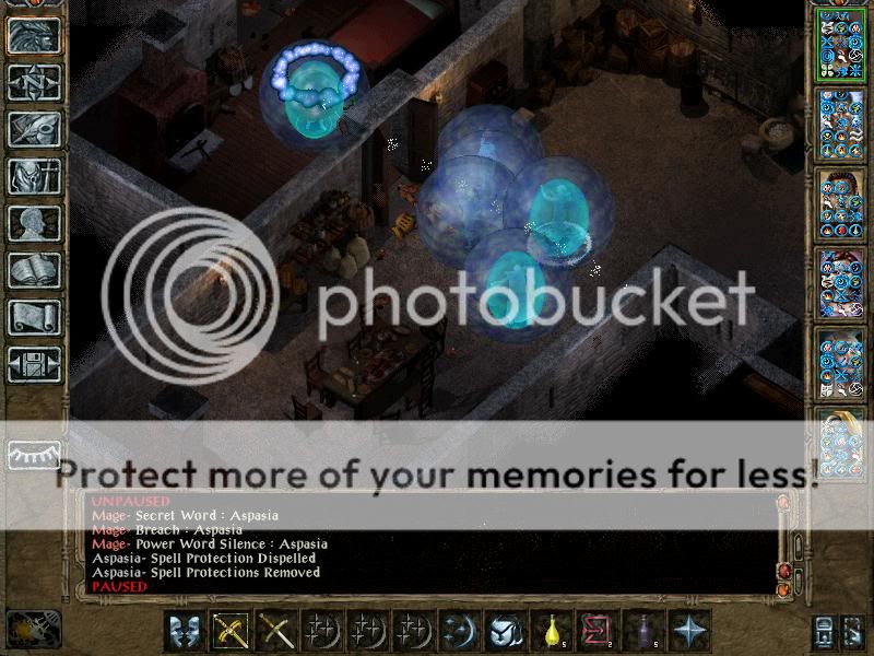 The party re-buffed well. Got a lucky 'Improved haste on all' wish, which preserved Astarta's 3 memorized Improved Haste spells. This is important, as it turns out when climbing upstairs, in addition to the vanilla traps, there is also a 'purge magic' trap on party. All buffs were dispelled. Didn't know about that (didn't test it, decided it would be as easy as in IA 5.0). Still, it was very lucky that the party was buffed with undispellable buffs like Giant Strength (Valygar and Grunt), Foreknowledge (Alia and Torham), True Sight (Valygar) and Improved Alacrity (Alia and Astarta). Also, the two mages has a Contingency and a Chain Contingency ready to be activated, and they did indeed. Alia charged hers with proEnergy, GoI and Mass Invisibility, Contingency with Haste, while Astarta charged hers with ProEnergy, GoI, ProElements and ProMagicEnergy. Also, Astarta cast Improved Haste on three of the fighters, while Torham cast Ironskins, and the fighters re-activated Hardinesses. Then the Mass Invisibility and other Contingencied spells triggered. The two mages cast ProMW, and started dispelling Sion's buffs. Sion fell in half a round, however the fighters were taking massive damage. RB activated Chain breaker Stance, Valygar activated Contact with Nature, Torham started Greater Restoration cast, and Koshi got REALLY lucky with his Thunder strikes from the Celestial fury katana. Well, it all went to the Riskbreaker Saros, who has enormous amount of HP anyways. Valygar got backstabbed by Ketha for 70 under Hardiness, and quickly eliminated her afterwards, while Torham completed Greater Restoration, and Saros and Grunt took care of Sulman (the enemy cleric). Alia summoned some Yuanti, and the two mages took participation in the fight by casting Breaches on enemies erecting Hardiness. Not a very hard fight, after the mage is down and the buffs partially restored.