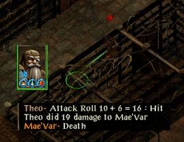 The need for avoiding mistakes was immediately clear at the circus, when I clicked on the wrong conversation option with Aerie causing her to attack. She hit Theo with a flame strike, but then disappeared. Upstairs, the werewolf damaged Theo several times and it took a while before he found a critical bolt to finish it (even with the assistance of Kalah who put a magic missile into the werewolf after killing Quayle). Aerie (now restored to normal appearance) didn't hold Quayle's death (or indeed their previous differences) against Theo, but he was not tempted to recruit her.