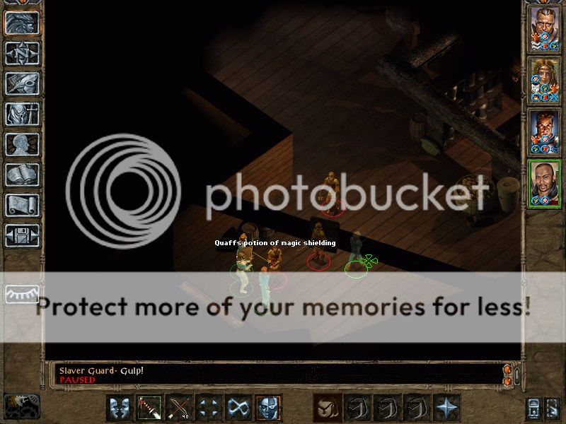 Slave ship, the slave guards had a lot of nice potions, guess how many I managed to collect? Hint; it starts with a Z and it wasn't a zillion. I did however, manage to get the gnome wizard separated from the human wizard due to the tendency of SCS enemies to follow sanctuaried characters (PC in this case) leaving Nalia and Keldorn to deal with only that one, Keldorn's dispel failed but interrupted most of his spells anyway with crossbow bolts of lightning (brought them at Gaelan's house next door, money well spent IMO).
