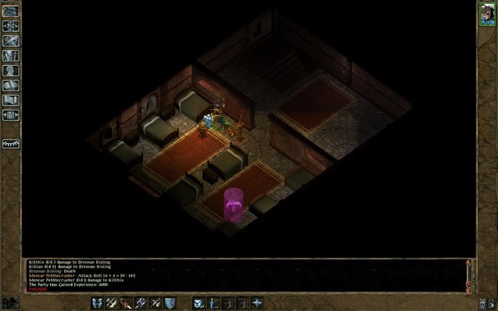 This meant we needed anti clay golem weapon for Korgan, so we battled Mencar's group. We had our pets distract the enemies (genie, berserker from horn, Kithix) while we beat up Brennan Risling. Bannen got targeted by mages and retreated. Korgan, was getting beat up very badly, and required several RoR heals from Bannen - then his morale broke! So Bannen had to do most of the fighting, with Korgan taking the spells from the mages - but success! Whew!