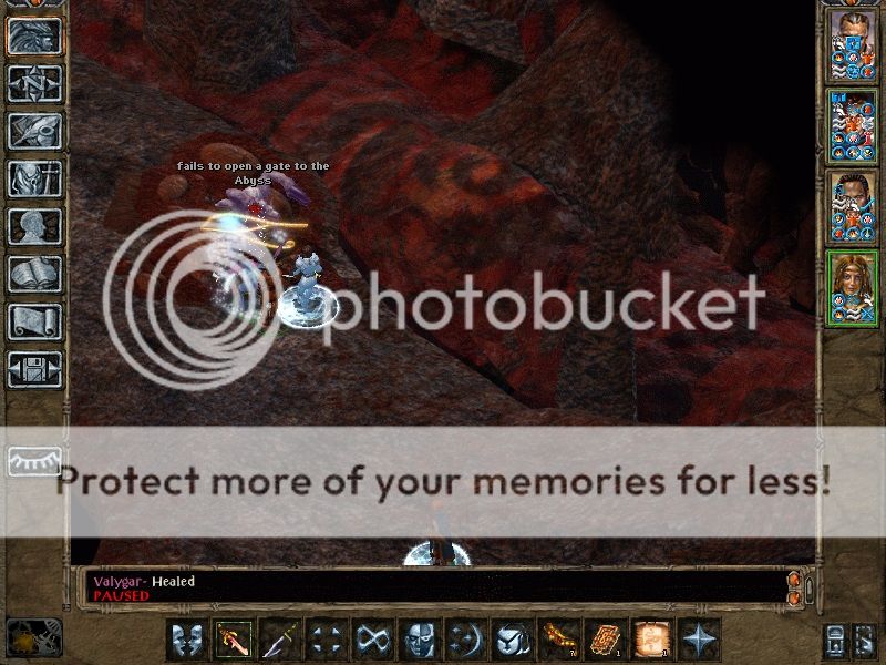 They get the demon to near death again with Magic missiles, and Hayk's and Jodocus's attacks, but the tanar'ri recovers. First to die is Gudrun. Next to go is Jodocus, despite numerous uses of Rod of resurrection to heal him. I resurrect him, and he continues his attacks, but they have hardly any effect. Eir is held at some point. Battle goes on for a while: Hizkiah uses wand of resurrection to heal Hayk and Jodocus, but they are not able to lash out enough damage to kill the demon, the slave is also quite bothersome. Soon Hayk, the beastmaster is almost dead. He runs for a while from the slave that is attacking him. I think I have enough time to resurrect Eudora, who has died at this point. But as soon as she comes back to life the demon kills her again. In last ditch attempt Jodocus gulps a Potion of Speed and Potion of Frost Giant Stranght and rushes the demon, in vain. With his death it is evident that all is lost. Next to go is Hayk, who had 5 hp left at this point. Then Hizkiah, who was at three hit points anyway. Last one to fall is Eir the child of Bhaal. And so ends her story.