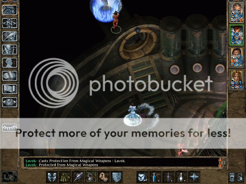 Finally the gang were back at Rayic Gethras' house. Jaheira entered his room under RoAC II and hid in the corner before summoning 3 nymphs. Using them for cover she plagued Rayic. His protection from normal missiles spell kept him alive until that finished, but he'd tried and failed with his worst spells by then and died before doing anything more serious than dominating a nymph.