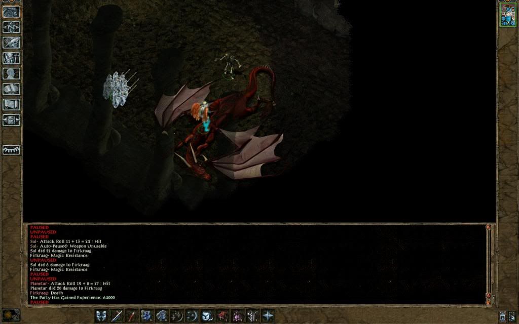 She got to level 25 for reconstituting the mask and, ironically, beat the final Guardian to death with MMM from herself and her simmy. After resting, a skull trap each from Sal & simmy didn't leave too much of Samia's group for the planetar and a skeleton warrior to mop up. A couple of skeleton warriors lay in wait for Conster before more summons led the assault on Firkraag with Sal backing things up with some energy blades. She had just finished throwing her 20 of those when the planetar laid the final blow on the dragon.