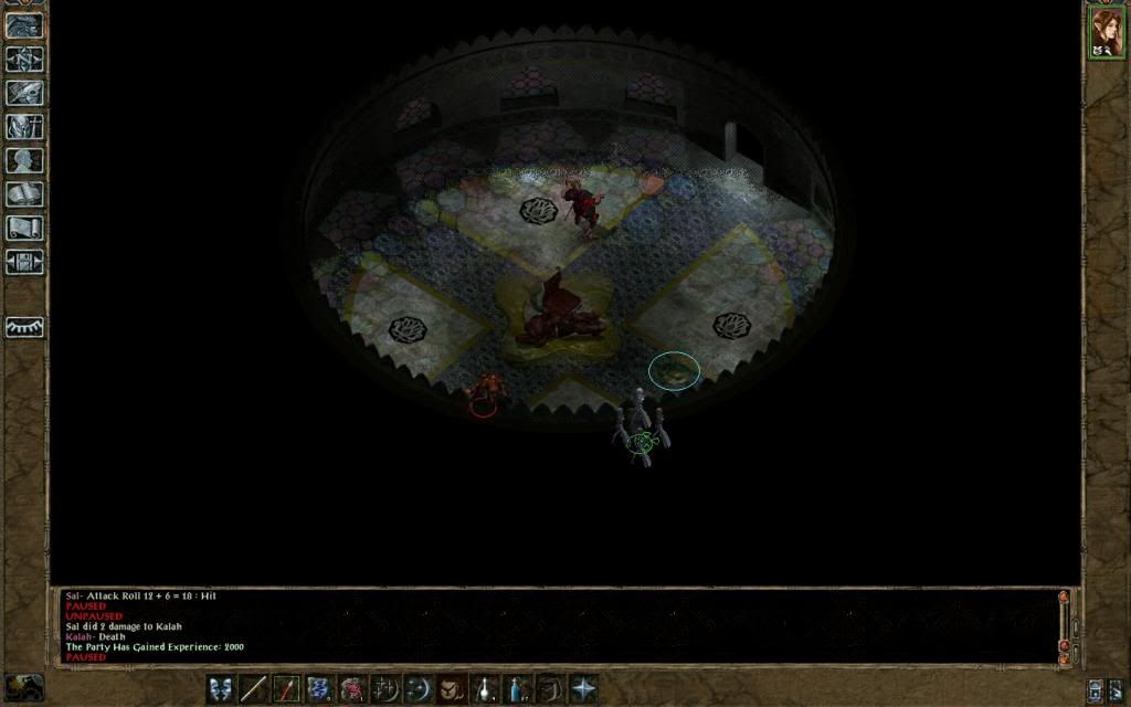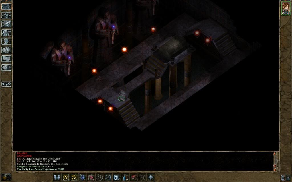 The last major objective in Athkatla was the Unseeing Eye. With the Shield of Balduran to hand Spiro was able to work through the beholders without problems. The lich underground with his escorting greater mummies proved a decent challenge and Spiro had to use healing potions to stay comfortable there. Some blind priests produced plenty of summons of their own, but none were able to make any real impression on Spiro. After the Eye was closed Gaal didn't last long.