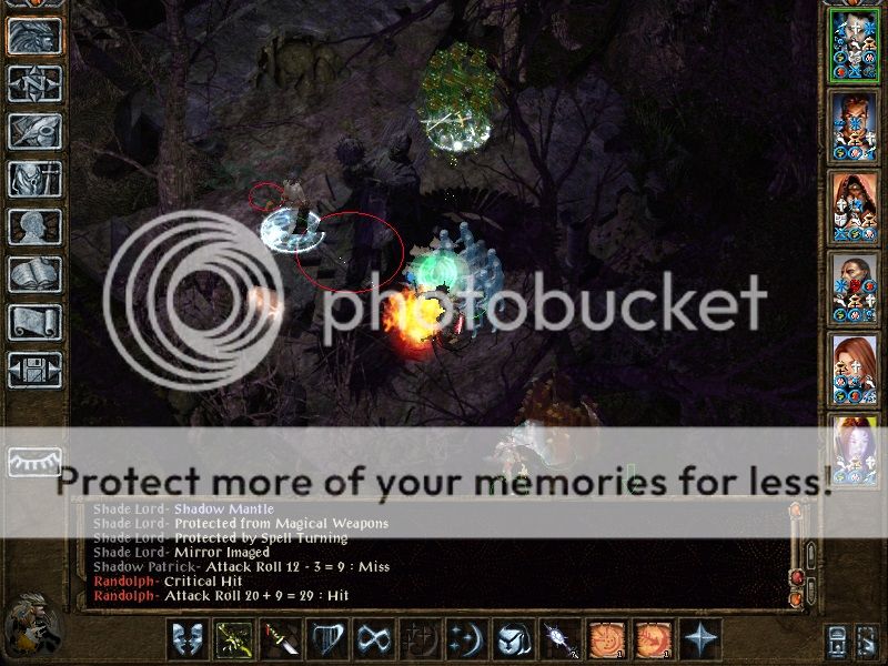 Returning to Athkatla we buy some stuff (glasses of ID ,girdle of hill giant strength, shield of reflection - not sure if I should use the last one as it's really too powerful, like the cloak or mirroring vs ranged attackers). Also started the eyeless cult quest, although didn't do anything more than attack the rakshasa in the sewers so far (being careful the fight doesn't move anywhere near the beholders who spawned just round the corner). Here I made a nasty discovery, the priest spell True Seeing does not affect rakshasas, unlike the Inquisitor's version. This left us unable to breach the rakshasa (who was buffed with Improved Invisibility, blur, MI etc.) or indeed for most of the party to hit him except on criticals. As you can see, Artemisia was crucial here, also lol at him wasting that 2x ray of enfeeblement sequencer on a character who doesn't need strength to do damage.