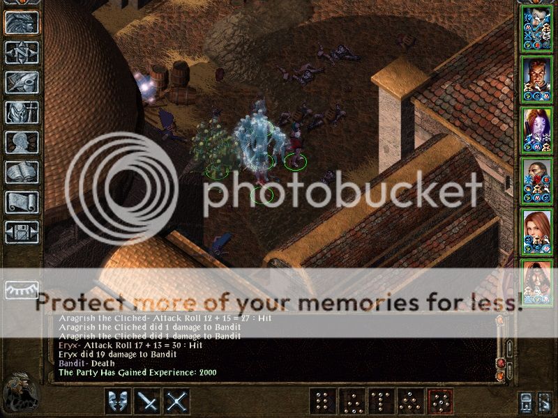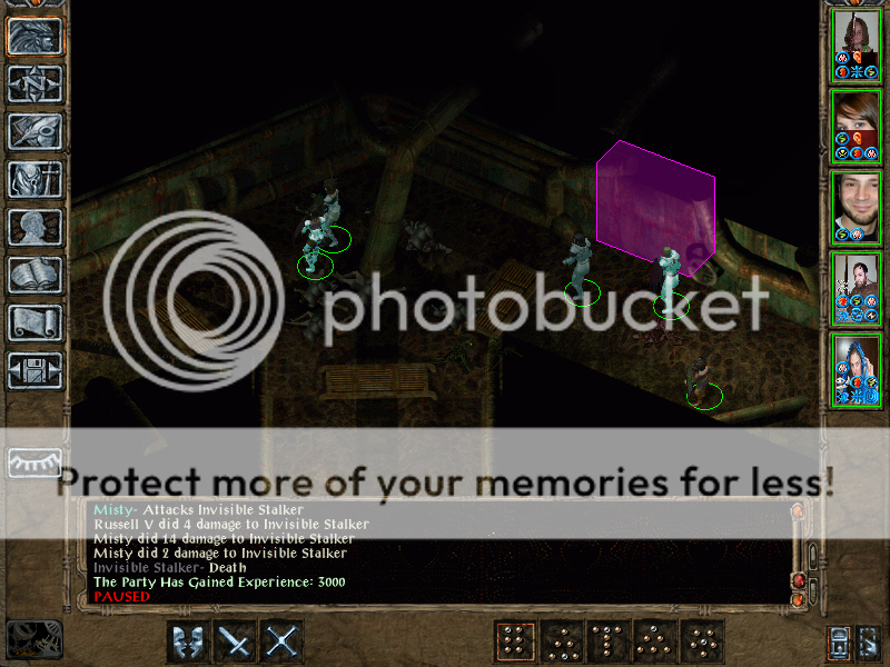 From the Tears Frasier picked up elemental resistance, immunity to normal / +1 weapons, +15 HP, -2 AC, +2 strength. When Jon and the demons appeared Frasier immediately ran. With Azuredge no longer usable (due to her change to evil alignment) she had no ranged weapon that she could use GWW with, but Firetooth still quickly wore down the demons. During that Jon tried a symbol stun and, remembering that she had somehow failed against one of those before, she countered with a potion of invulnerability. Mislead is always a worrying spell as it potentially allows the caster to get into maze range, but Frasier kept running round and soon had only the slayer to worry about. With him at near death victory seemed assured when Jon resorted to PW:cheating bastard!