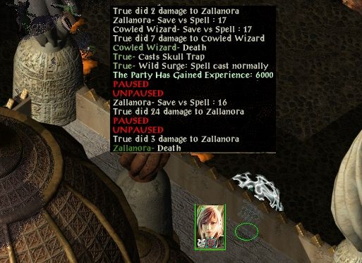 On entry, she used a trigger with triple lower resistance on Mel and then tried to hit her with spell damage. That proved harder than expected as her chain contingency triple improved chaos shield did not seem to be working in this area and all but 1 of her attempted NRD spells surged - and the skull trap that did succeed was negated by a heal surge! Judging from later experience with casting something about the area had prevented the improved chaos shields from stacking; even with only a single one functioning though, the chance of a spell casting successfully through NRD is above 60%, so she was very unlucky with those opening attacks.
