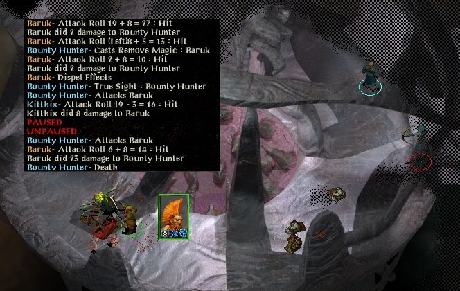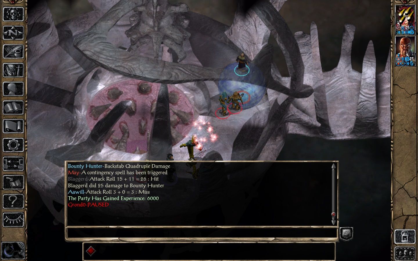 There was another glitch fighting the illithid when May ran out of MMM and auto-moved into an attacking position before I could react. As a result he was targeted by a psionic attack and stunned - fortunately the illithid didn't attack in him preference to Blaggerd or a mordy sword though and he survived. I noted in that encounter that his Otiluke's Sphere contingency didn't work; resetting it for the final illithid room and testing it out under somewhat more controlled conditions confirmed that a saving throw is applied even when casting that spell on yourself in BGEE - making it a far less useful spell.