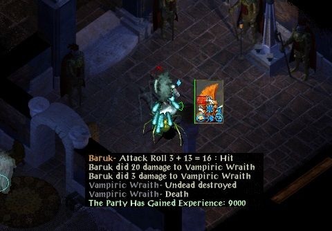 We mop up what's left of them and visit WK. Farsight is needed here, since Hogar doesn't yet wield a +2 weapon. Best to avoid opening the door, it seems...(the pink figures there are Vampiric Wraiths)
