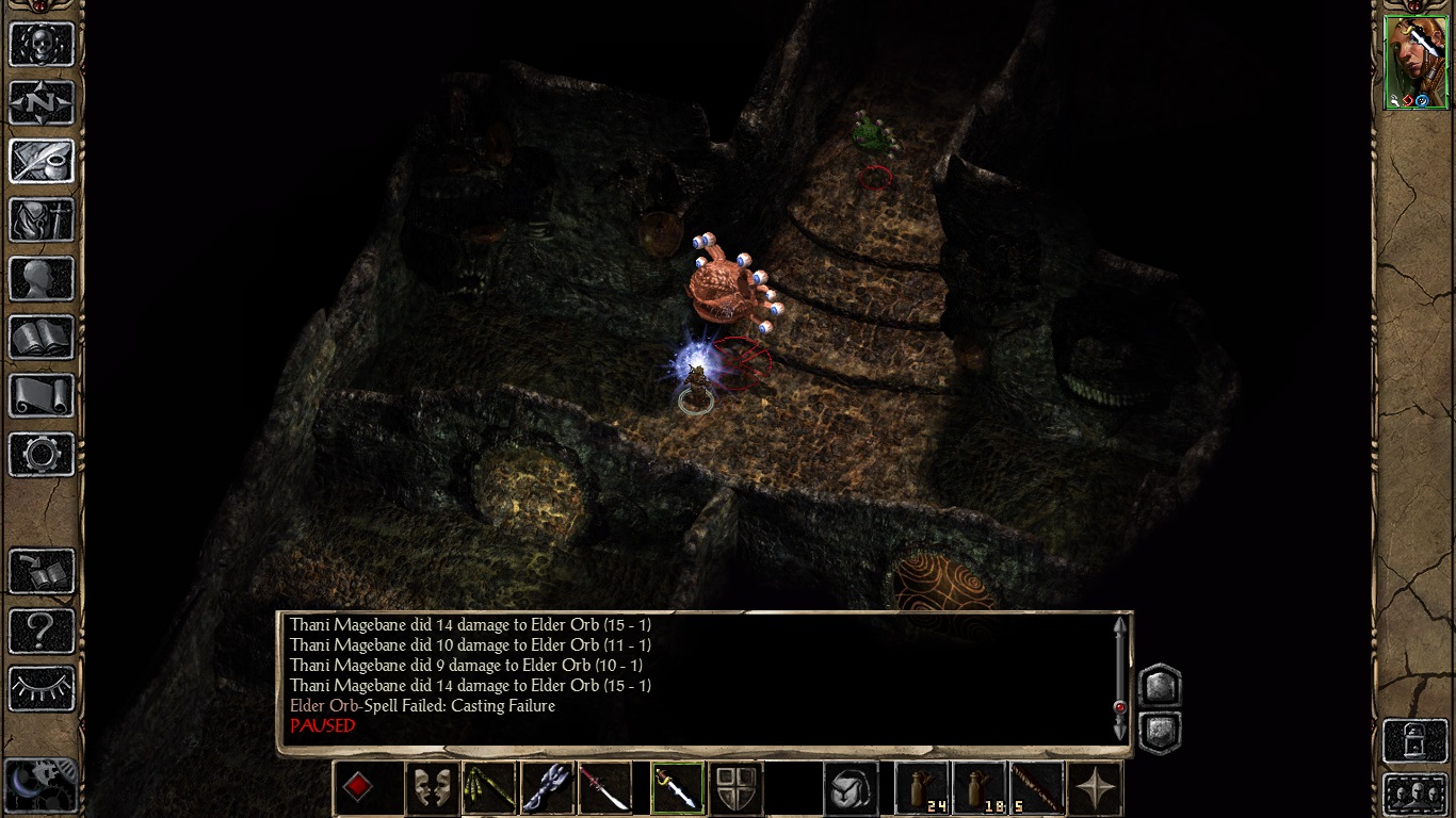 She had a bit of a scare at the Fear Trial in spite of having the Dragonslayer sword equipped (the Nymph Cloak isn't usable by WS), when she was spotted by the Beholders, including an Elder Orb. The floating eyes followed her back to gate. Lack of focus on my part could have ended her run there. First of all, when I unequipped the Dragonslayer sword and put Ilbratha back in its quick weapon slot, I somehow missed the fact that I had Ilbratha, in which Thani had no proficiency, now equipped as my main weapon instead of the FoA, so she was fighting with less APR, worse Thac0 and lower damage output.
