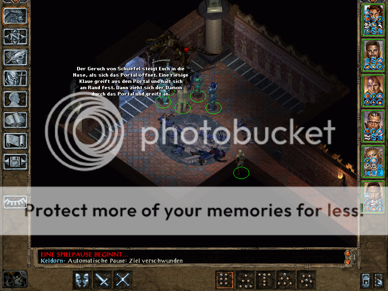 Thani rested before placing the final tear in the portal, so as to be well-prepared for the final showdown against Irenicus. I haven't played SCS v28 before (at least not up to this stage of the game, am much more used to SCS v21), and I hadn't played vanilla BG in years, so I was very surprised to see the battle start off with Slayer Irenicus surrounded by different types of demons.