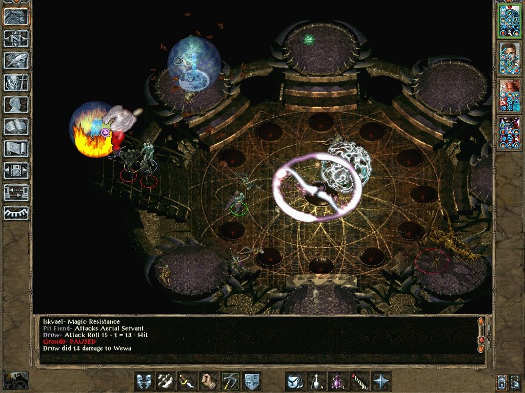 Two GWWs took down the demons really fast. A deva was summoned and scouted ahead, being sure it i seen first. Initially I tried dispelling Irenicus buffs with dispelling arrows then acid arrows - but even with GWWs, the Slayer was only slightly damaged. Fortunately, Irenicus hated the deva - Russell VII switched his equipment around to get 80% magic resist and charged with his Carsomyr - Irenicus ignored Russell VII for the most part and paid the ultimate price.