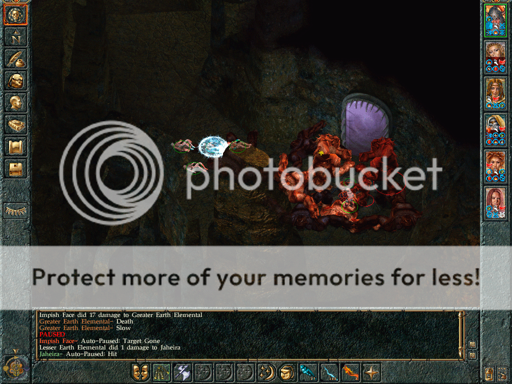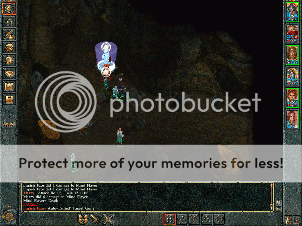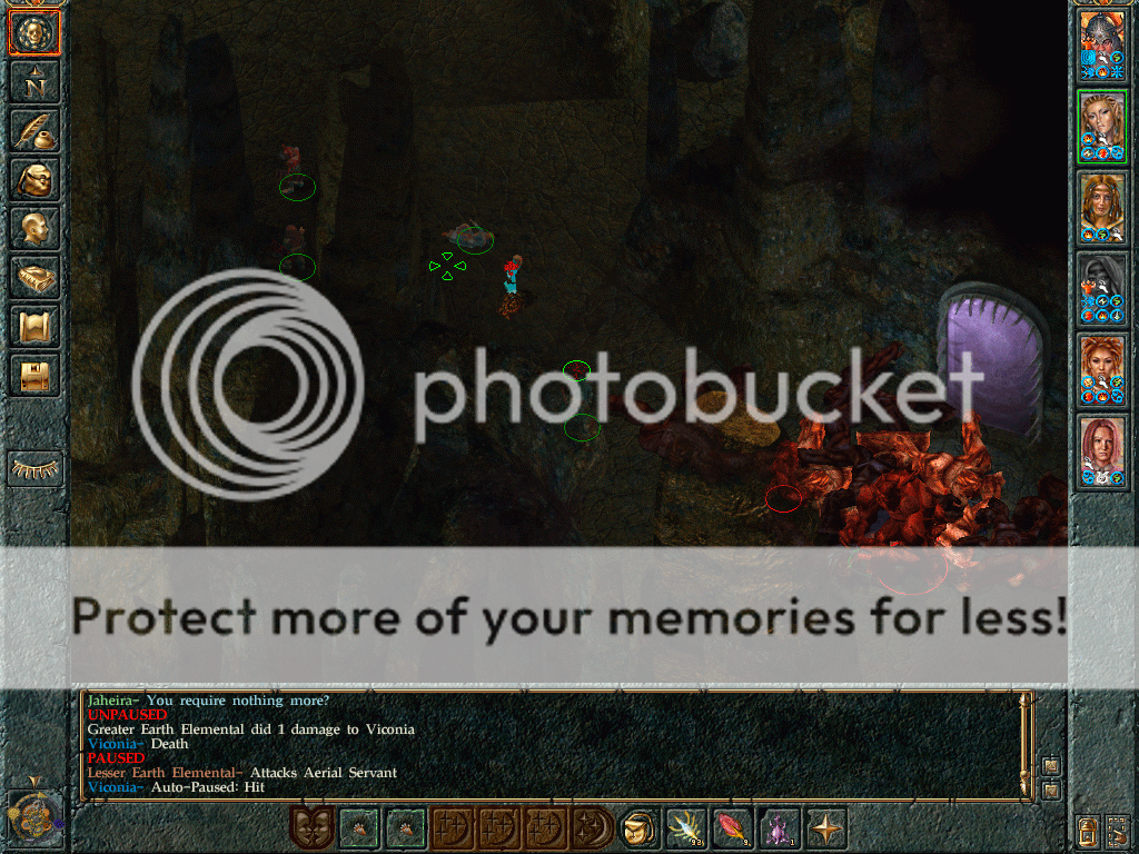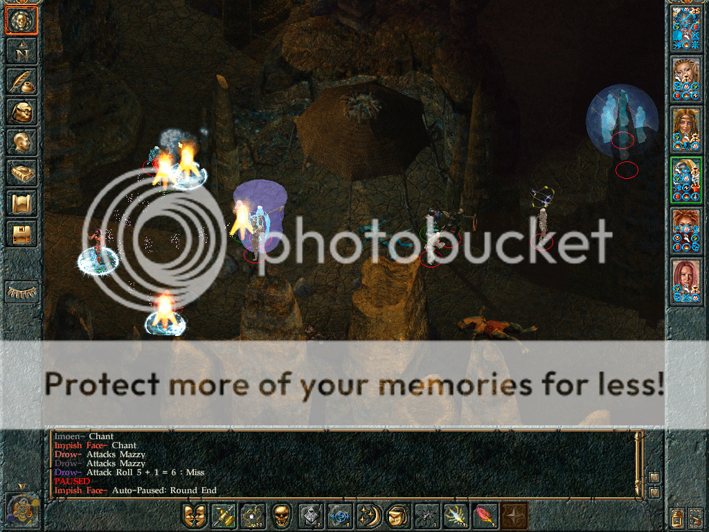 The troll fighters... aren't. At least until someone visible approaches them. They don't survive, their trolls were very reluctant to die once knocked down but after a few whacks with the FoA they stayed dead. Kyland Lind and his bunch got Web, a skeleton, Kitthix, and rage and didn't manage to get off a single offensive spell. Instead of Belm, we get... an iol Gem. Adratha is left alone, and Cernd (never seen this before as i usually let him in my party) really does tear Faldorn apart. We had left a skeleton outside by the Spore Mounds where Cernd waits for you and he seemed to take issue with it after the fight with Faldorn, trying both Charm Person and Hold Person on it. He didn't attack it, but repeatedly tried to charm it or immobilize it.