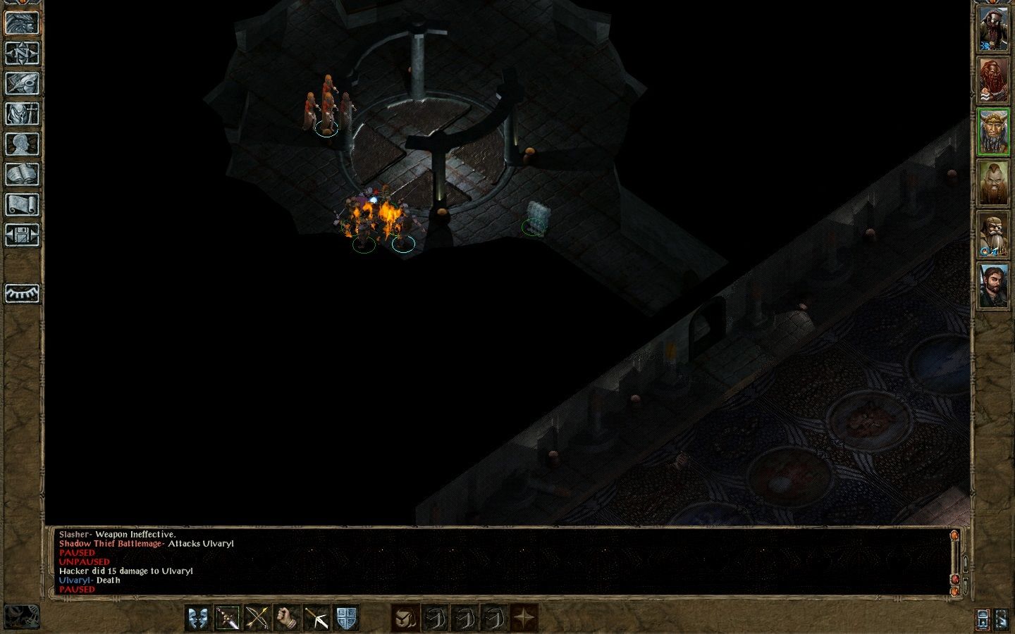 Dominique used a portal and prepared to fight mephit portal room. She used a Monster Summoning scroll and ended up with an Ogrillon friend. She then cast some buffs on herself (Blur, Stoneskin IIRC), opened the door, sent the summon to engage mephits, retreated so the aggro would change, used OS and rushed past busied enemies to destroy Radiant Mephits' portal. The clone didn't manage to cast a single spell - Domi interrupted three of them with first magic missiles, then Chromatic Orb scroll and finally Minor Larloch's Draining scroll. I already summoned Domi's familiar so she used it to advance to wand traps room. The trap just before it ate the last charge of Stoneskin so no damage was recieved. Wraith Form was used before the trap, becuase I wanted to try if the spell could nullify the damage. Apparently not. Next stop - the doppelganger meleed while still under the WF. Ulvaryll was fallen this time, but the blade failed a save vs Horror spell cast by the mage, so a little bit of running around ensued (she was under Oil of Speed, so I was a little bit scared she would wander in the bunch of yet not killed enemies). After a couple of rounds she regained her composure and killed both the mage and the thief. WF was used and while it still lasted the northern group of duergars were killed. Fireball scroll read to kill the mage from out of LOS. Assassins didn't pose a threat since the blade's hp pool was high and I kept it that way with potions of extra healling to mitigate the backstab damage. Weeeeeee! Fresh air!