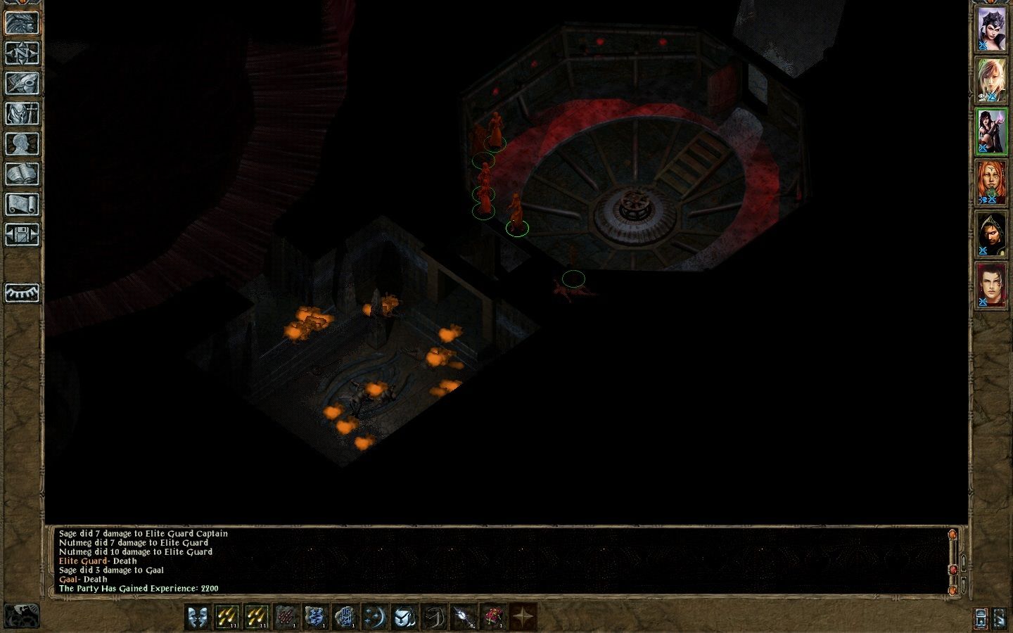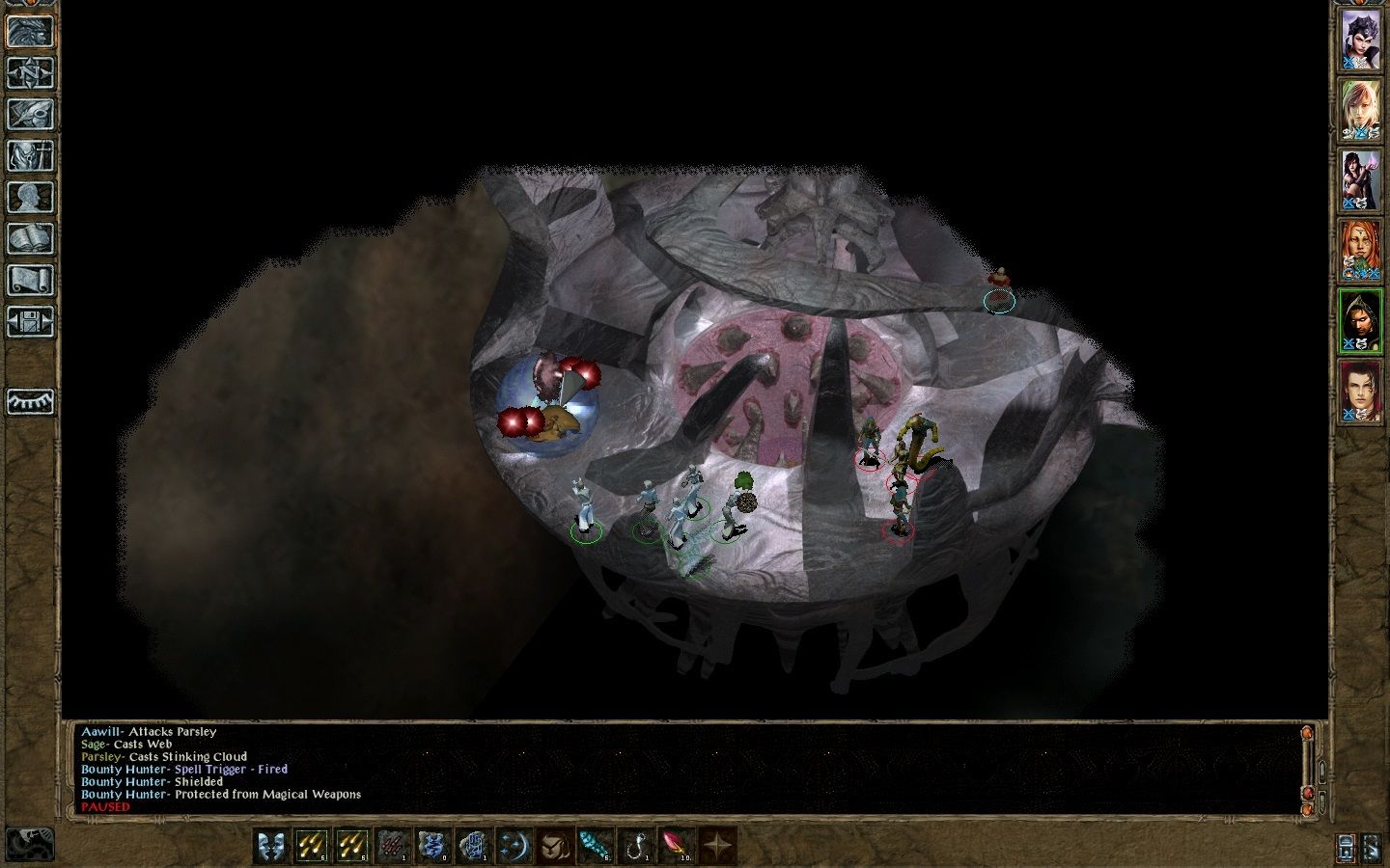 Next, disaster strikes. Rayic summons Ogres, and tosses a Confusion. Both Mazzy and Khale are affected. Aerie has but one Break Enchantment memorized, spending the first to de-charm Mazzy.