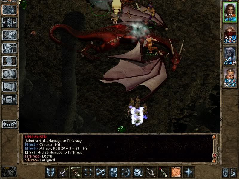 Tolgerias summoned a Nishruu to attack Viertes, in spite of being plagued by Jaheira's insects. He also managed to get every protection spell in creation up. Meanwhile his mage was cleverly throwing fire spells at the fire elemental:
