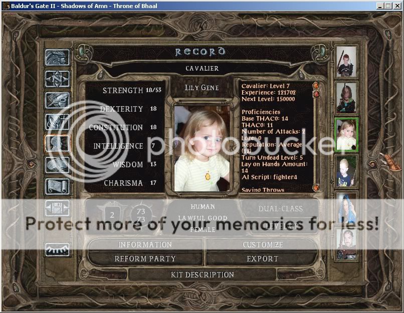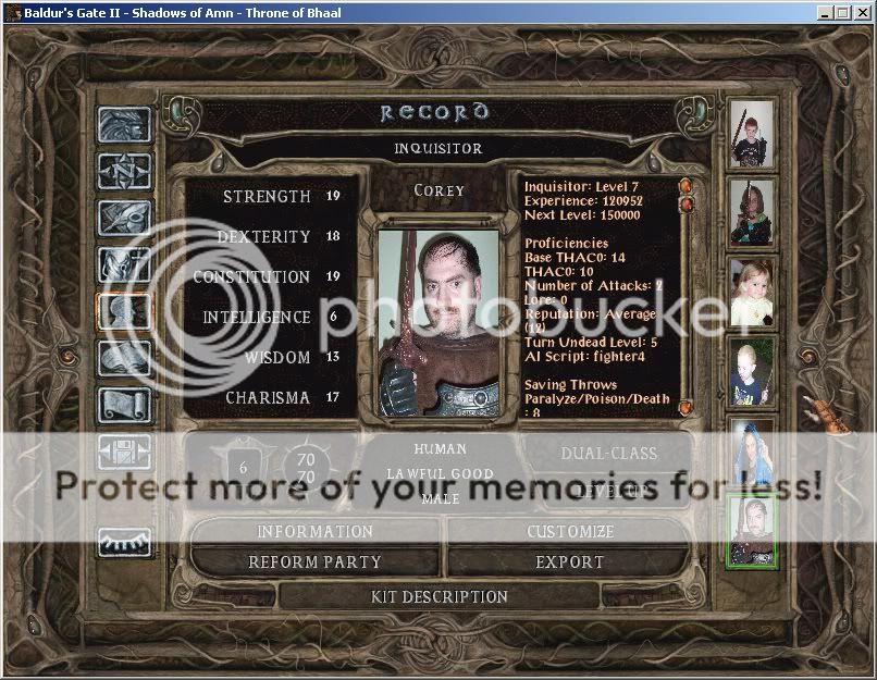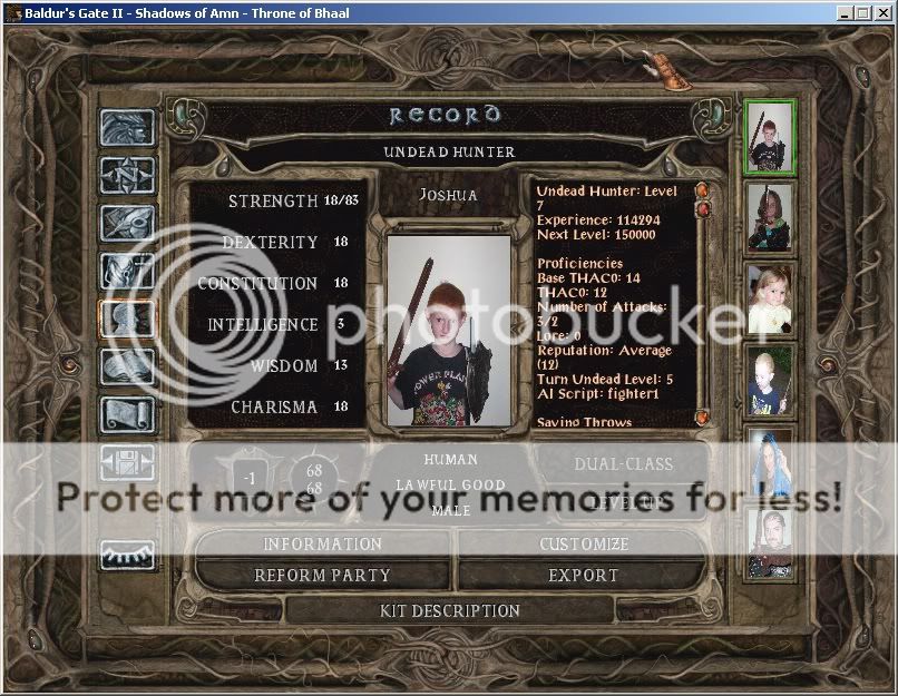 Wierdo and her merry band are also about to enter Spellhold, having completed EVERYTHING (I think) in Chapter 2 and Watcher's Keep and killed Demogorgon, even Kangaxx. All with an install that includes SCSII, Ascension, Improved Vampires/undead, Improved Fiends and Smarter Mages/Priests.