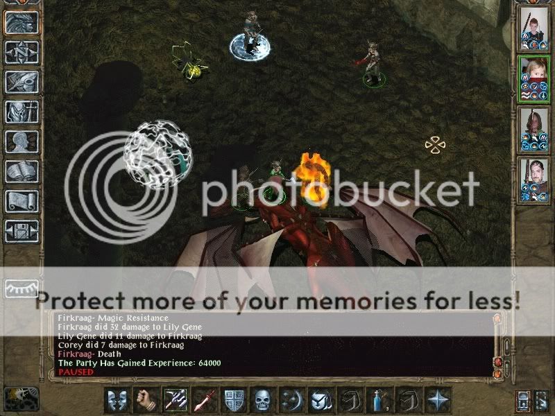 The party then moved foward. Firkraag of course was still hostile from our last fight and opened with a firebreath attack - hah, lizard! We were ready for that and that did nothing (well killed some weak summons). Hanna charged, used kangaxx ring haste. She had to potion like 2-3 times, and RoR heal 1 time, then victory! Paja, you have been avenged.