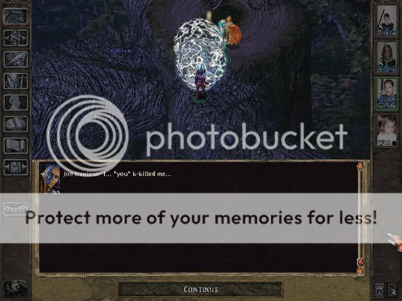 On a way back we were intercepted by Dermin with his final warning to Jaheira. As we were short of spells and felt sleepy at the moment we took some outdoors rest and missed Jaheira by sleeping... She returned to Harper Hold to face judgement alone. *So that's how you think of me, lassie? Aye?!? No way, you can't throw me away so easy!* We paid one more visit to HH, rejoined Jaheira and finished Mae'Var guild: