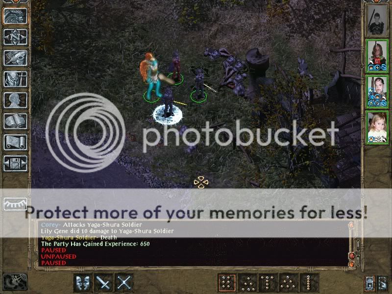 Next up was the Forest of Mir temple. Found a Gorion imposter and battled it out with his undead friends. [I had paused here and removed Carsomyr and equipped a shield and the improved mace of disruption so Corey could not be level drained] The battle went very well thanks to 2x sunrays (daystar, helm of brilliance). We encountered Nylee, who told us the secret of Yaga-Shura's invincibility. We have to get two hearts from his temple. That's where the party will head next.