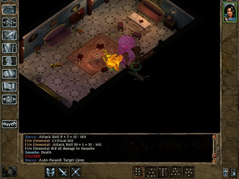 Afterwards, we raided the tomb of king Whatshisname of Tethyr, and got doublecrossed by the relic hunter Samia and her merry band. They appeared inconveniently right around us, which I did not remember. However, despite our otherwise depleted spells (I'd foolishly forgotten to redo the spellbooks of Hador and Jaheira after their level drain incidents), after a couple of Chaos spells, Samia found herself supported by quite the ineffectual group.