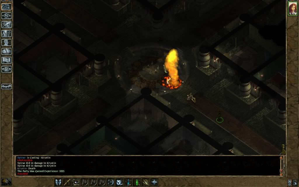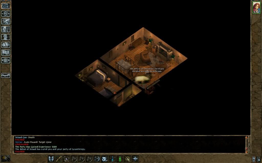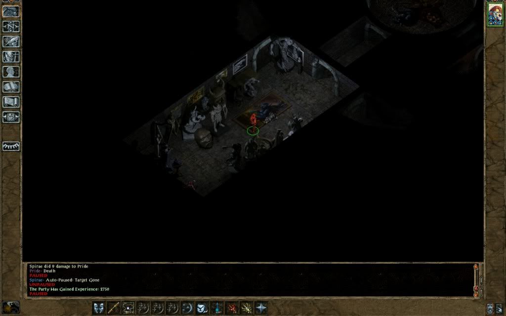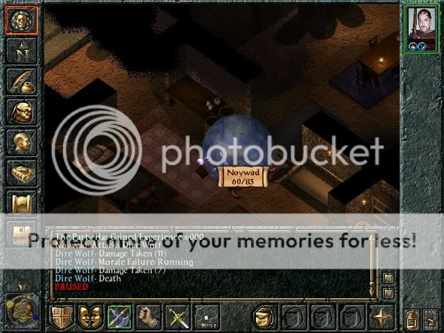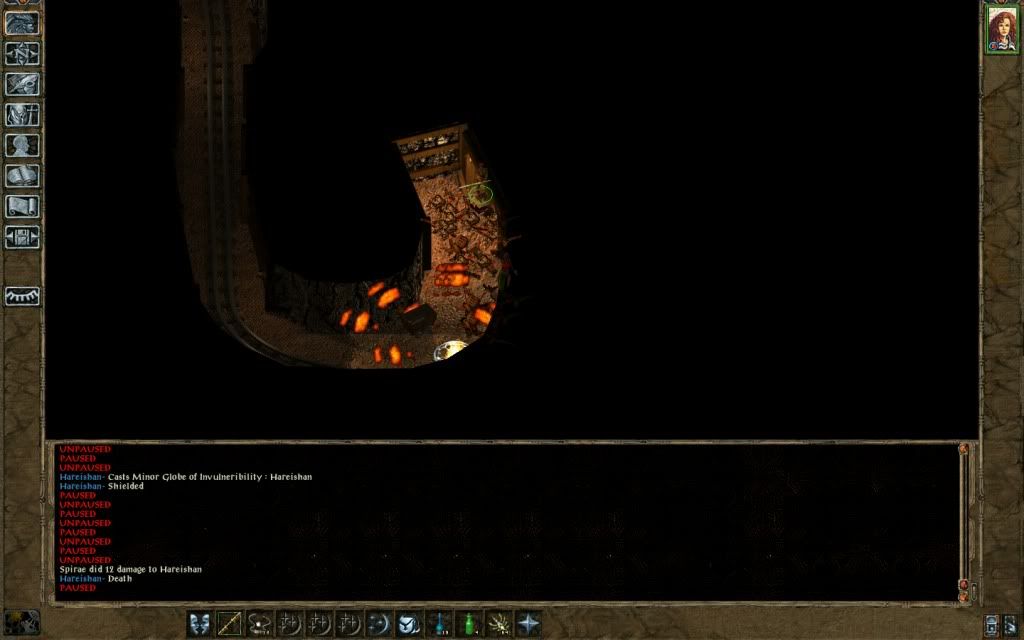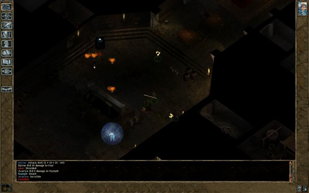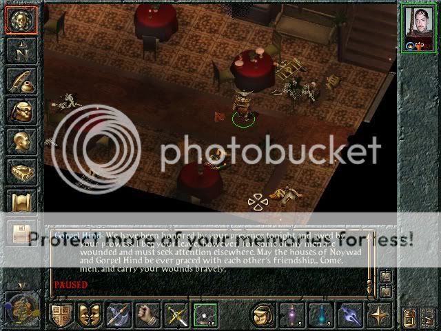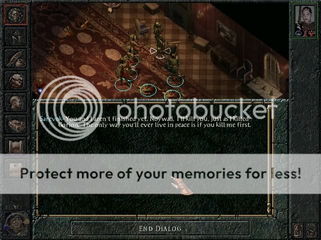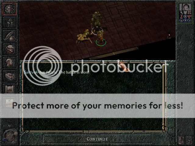 Semaj fell pretty fast, switched targets and burned down Tazok taking no damage.I creeped up the left and saw Sarevok run real fast, my initial pull with a dispel arrow must not have connected. I ran to the opening and got in to my equipment screen (which unpauses the game in my case), removed the shield and equipped the bow and fired my ONE dispel arrow -