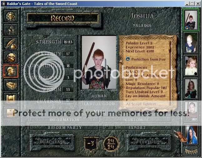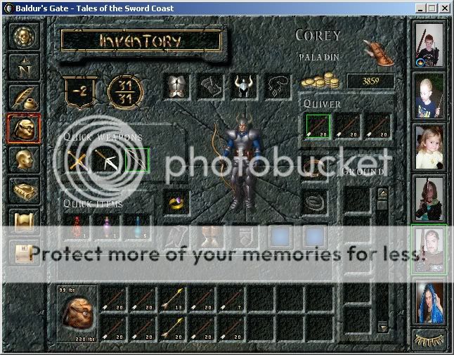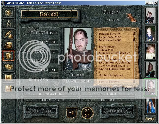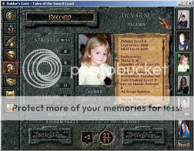 RIP Elie. She managed to make it past the Friendly Arm Inn and work her way to the Nashkel carnival, adding to her party (in order)Elie -- Female Elf -- CN Fighter 1 / Mage 1