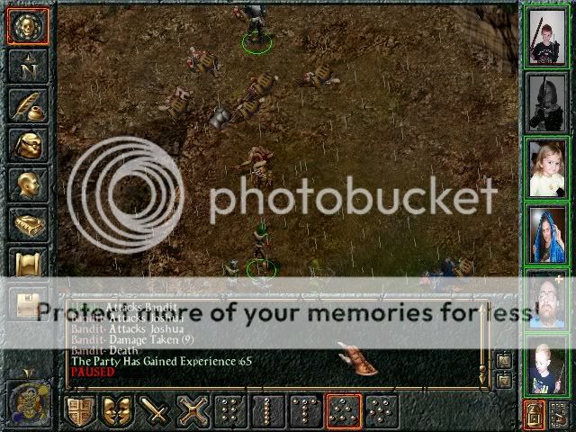 Sadly, a group of ten guards spawned in and around the party. Alora fell quickly. On the long walk back to Beregost they were attacked by Wyverns, and Kivan fell as a distraction to keep the Wyverns from targeting my squishy mages ( Maeri & Imoen ). Kivan was heavily hit and then nailed by some nasty Wyvern poison, and he couldn't down a potion before the poison downed him. So, after much dragging back to Beregost, healing, selling, and re-equipping, plus buying the Beregost temple's entire stock of healing, antidote, and purple potions, they marched back to Cloakwood and finished the job.